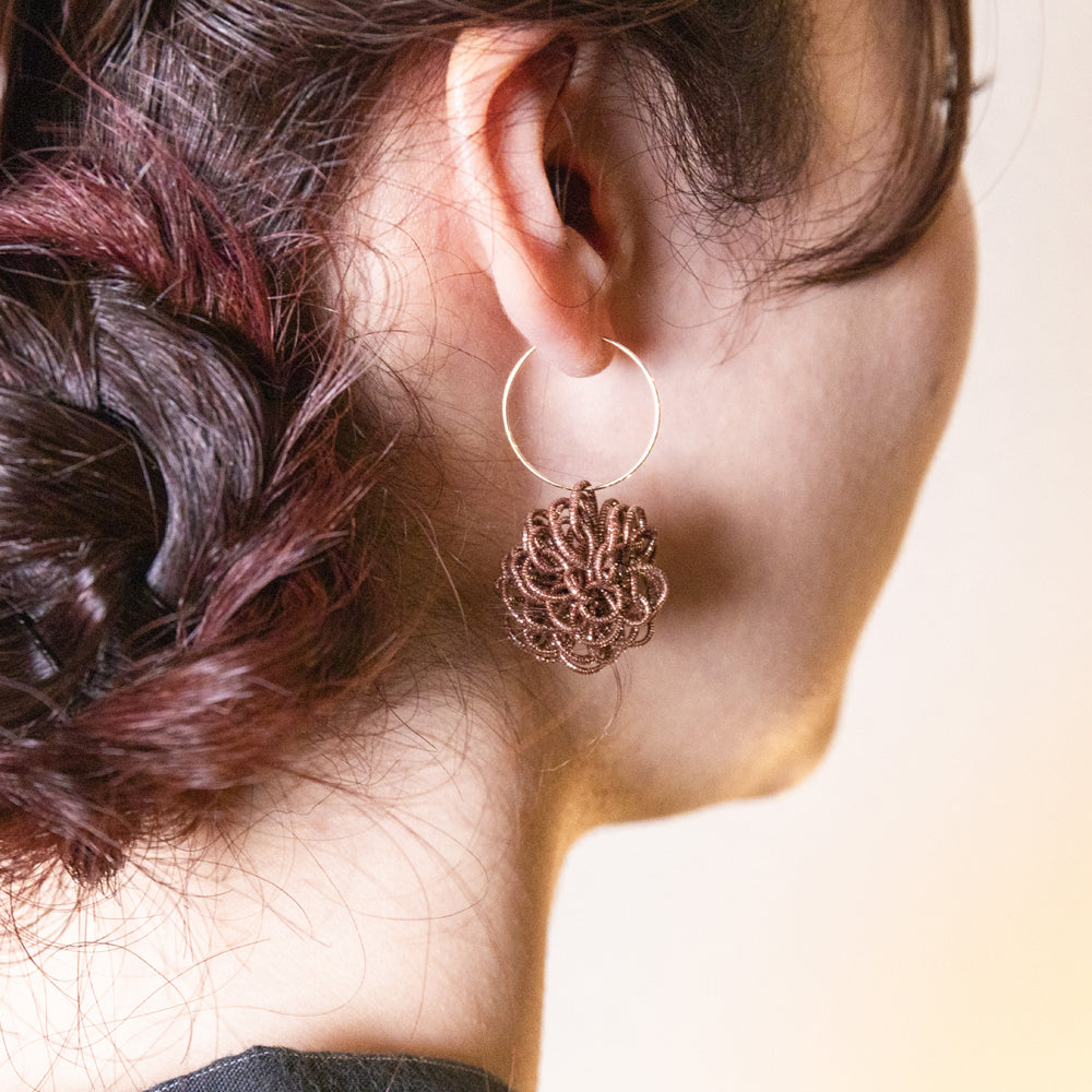 キラキラ光るラメ入り水引のポンポンピアスです。ポンポンと可愛らしく、明るいカラーが目を引くアイテムです。金具部分がフープになっているのもアクセントで、揺れるの大人可愛いピアスです。