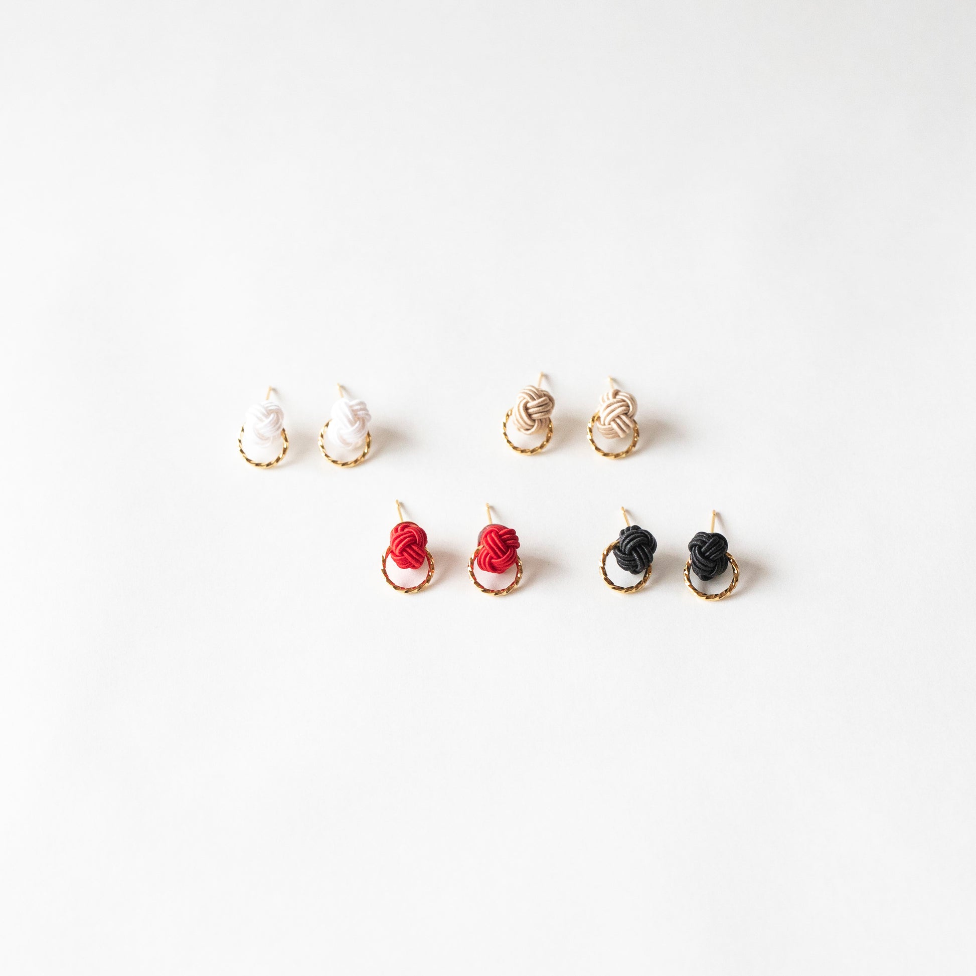 水引の繊細な美しさと、シンプルモダンなデザインを融合させたアクセサリー「結環(ゆいかん)」。結びの形には「縁をつなぐ」「幸せを結ぶ」という想いを込め、ポイントに添えたゴールドのリングが洗練された輝きをプラスします。シックで華やかな為、和装にも洋装にも馴染み、日常のコーディネートにさりげないアクセントを添えてくれます。