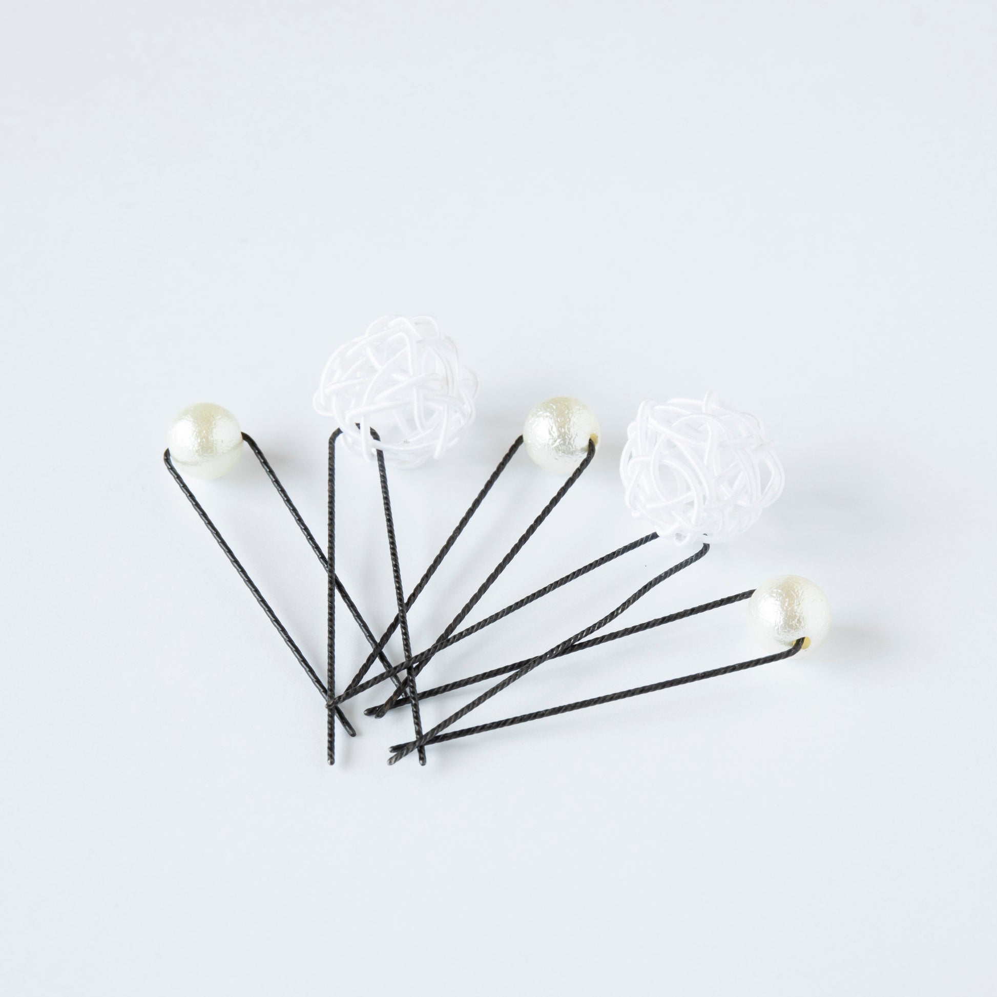 繊細な水引細工の鞠玉と、上品なパールを組み合わせたヘアピンセット「結び鞠(むすびまり)」。小ぶりながら存在感があり、まとめ髪にさりげない華やかさを添えます。浴衣や和装にはもちろん、卒業式や成人式などフォーマルな装いにもおすすめです。ひとつひとつ手仕事で結びあげた水引の鞠玉は、良縁やご縁を結ぶ意味も込めてお作りしています。